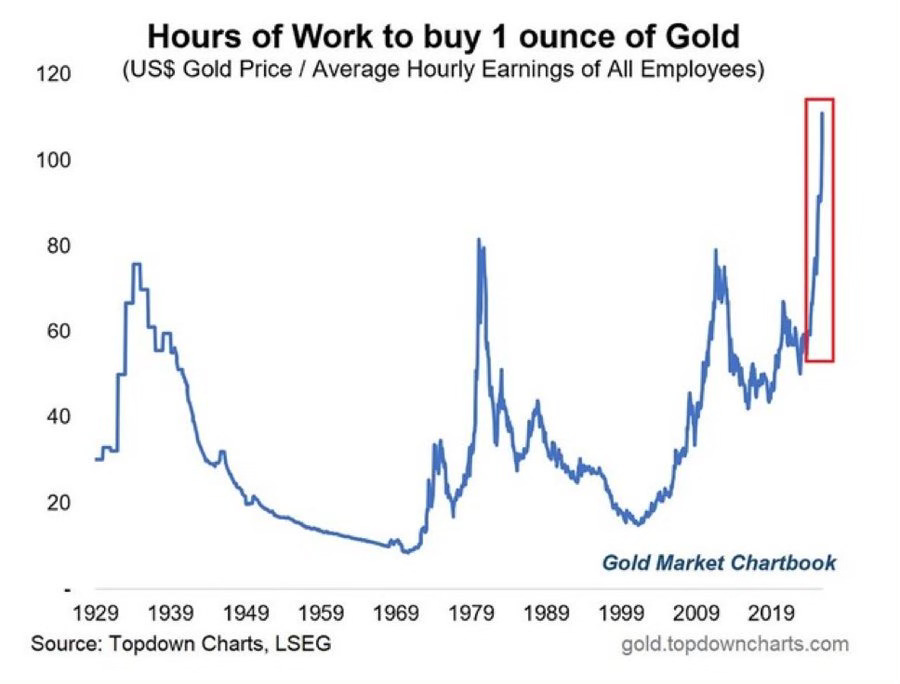 Back in the 1970s, the average American worker needed about 12 hours on the job to afford an ounce of gold. Today? Try 100 hours. That’s four full workdays, just to buy one ounce.