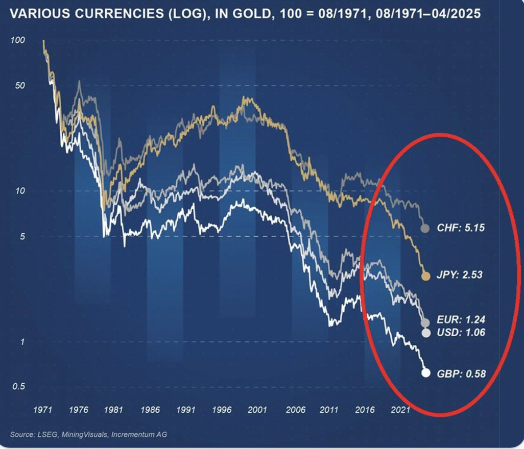 The Swiss franc, long seen as a financial fortress, is down 73%. The British pound has collapsed even more, losing over 88%.