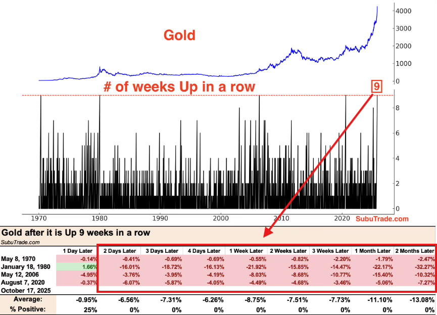 Gold had also been up for nine straight weeks, something that’s only happened five times in history. It’s never made it to ten. Each of those streaks ended the same way, with gold averaging a 13% correction in the months that followed.