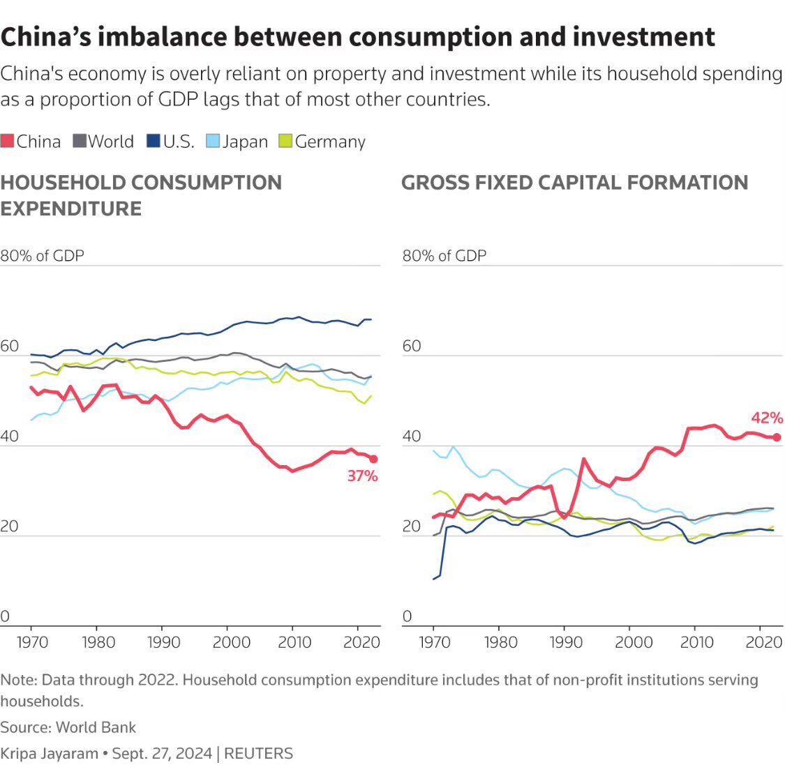 Consumers aren’t spending the way you’d expect. In fact, household spending only makes up 37% of China’s GDP way below the global average. Meanwhile, investment makes up 42%. That means China’s growth is still driven by construction, manufacturing, and government projects, not by its own people buying stuff.