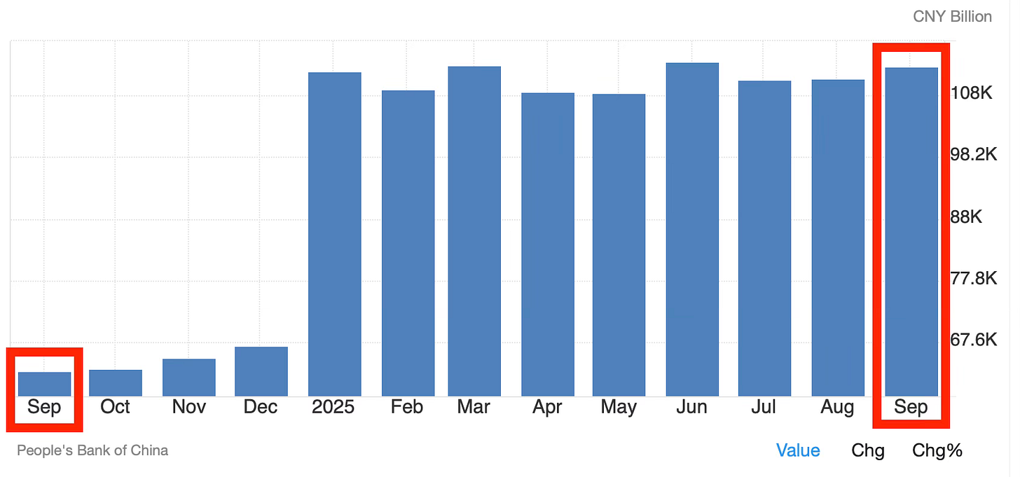 China’s M1 money supply, the most liquid, ready-to-spend form of cash in the system has exploded. By September 2025, it hit 113.15 trillion yuan (15.84 trillion USD), an increase of about 80% in just one year.