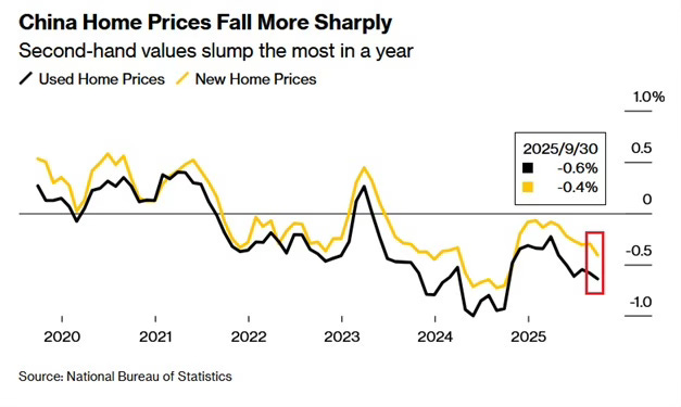 Meanwhile, property investment fell 13.9% year-over-year in the first three quarters — the weakest level since 2014. This isn’t just a market correction anymore. It’s a confidence crisis. For millions of families, their apartment isn’t just a home, it’s their life savings. When that starts losing value month after month, spending stops cold.
