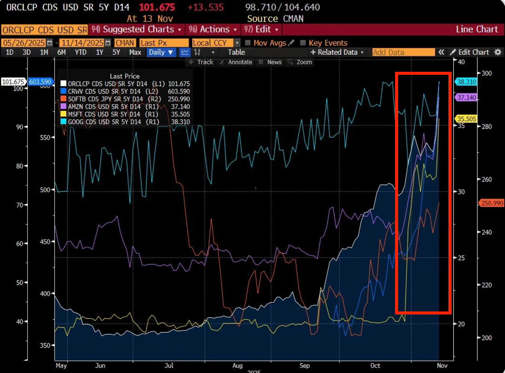 You are looking at CDS, the same thing Lippmann used to bet against housing is ripping higher across literally every company tied to AI capex. Oracle, Snowflake, Amazon, Google all of them.