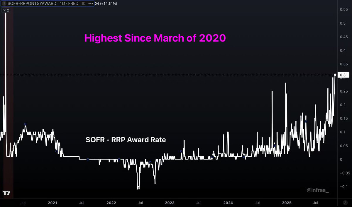 This is the same movie from 2019, when repo rates suddenly exploded from 2% to 10% overnight because reserves got too low. The Fed had to rush in with emergency cash injections just to keep the system from locking up. Powell swore it wouldn’t happen again and now here we are, déjà vu with better branding.