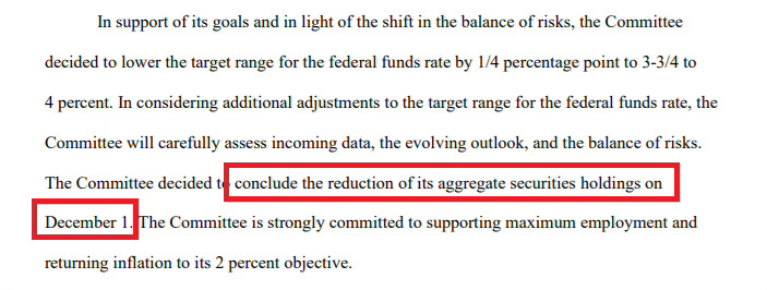 Forget the rate cut, this was the real headline. The Fed just killed quantitative tightening. On December 1, it’s officially over.