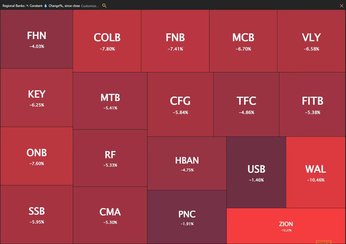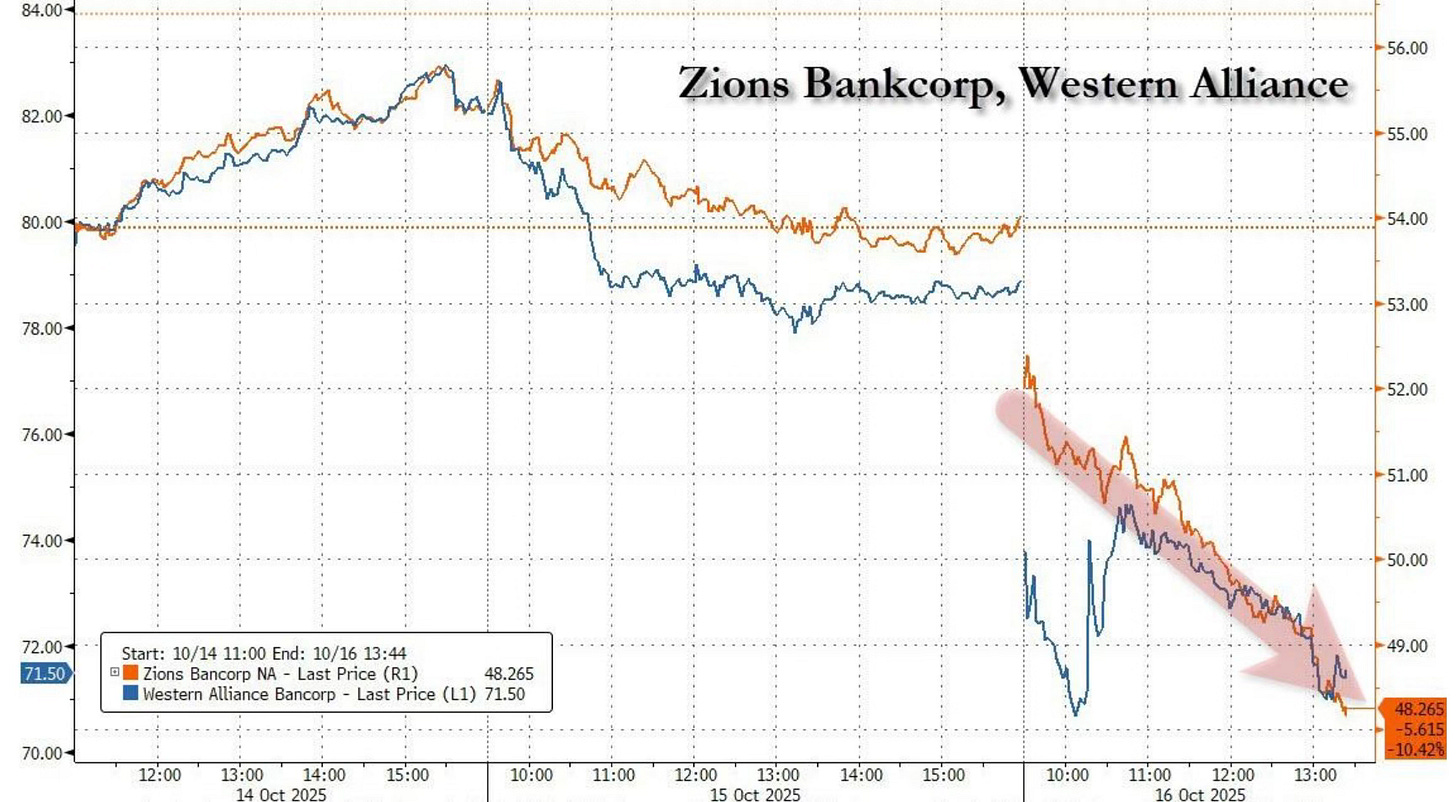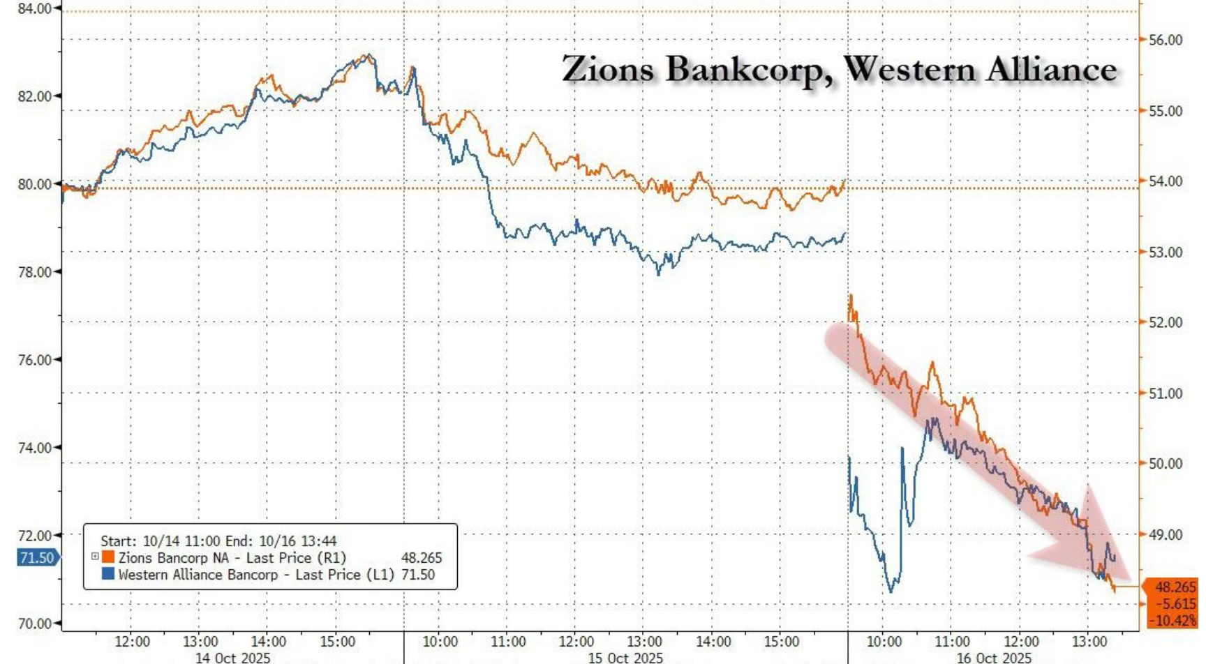 Zions Bancorporation kicked off the sell-off after its stock plunged over 10% when the bank revealed a $50 million charge-off tied to two business loans worth around $60 million. The loans came from its California Bank & Trust division, and the bank said it found major “misrepresentations and contractual defaults.”