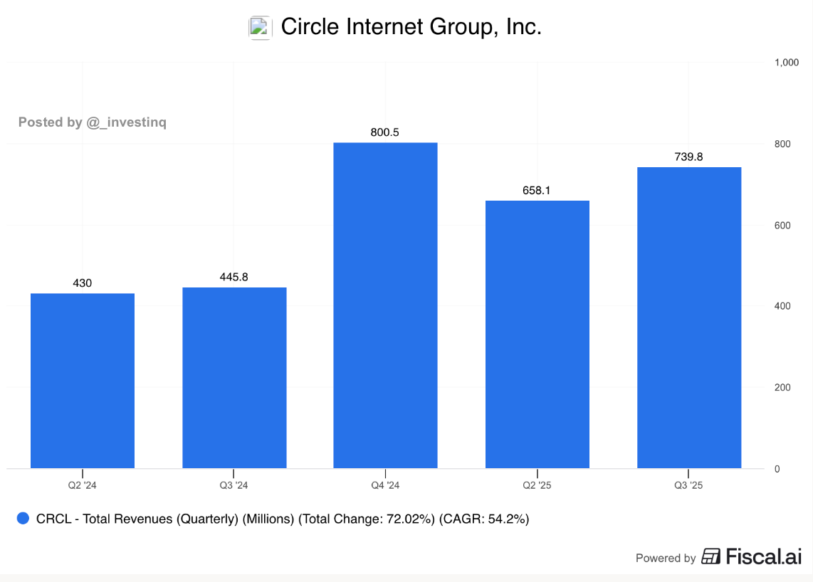 In the third quarter of 2025 alone, Circle generated roughly $740 million in revenue and 96% of that money came from interest earned on those reserves.