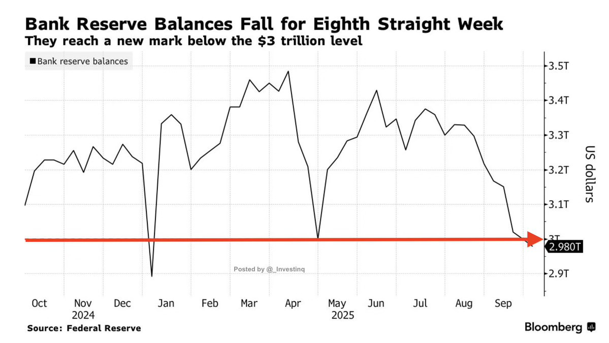 At the center of this issue are bank reserves, which are basically the savings accounts that commercial banks keep at the Federal Reserve. They use these reserves to settle payments with each other every day like Venmo for banks, but on a trillion-dollar scale. Those reserves fell below $3 trillion, a level the Fed quietly considers the border between plenty of liquidity and not enough.