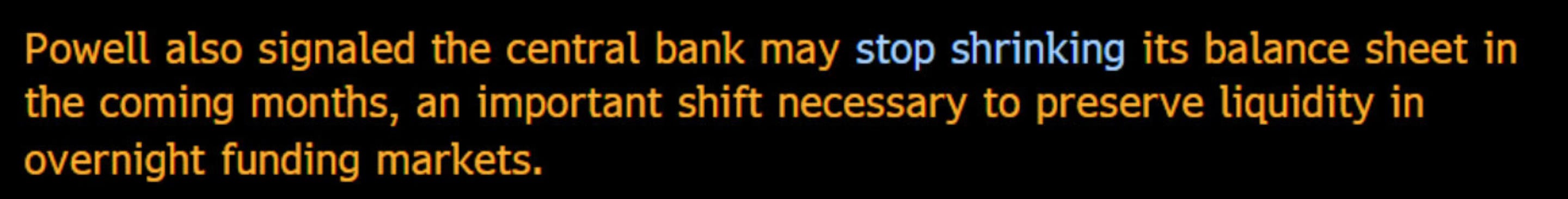 Imagine a big swimming pool of money. QE filled it to the top; QT has been draining it for two years. Everything looks fine until the water level gets low enough that the pumps start sucking air. That’s roughly where we are now, which is why yesterday Chair Jerome Powell has hinted the Fed might stop QT soon, because draining much more could break something.
