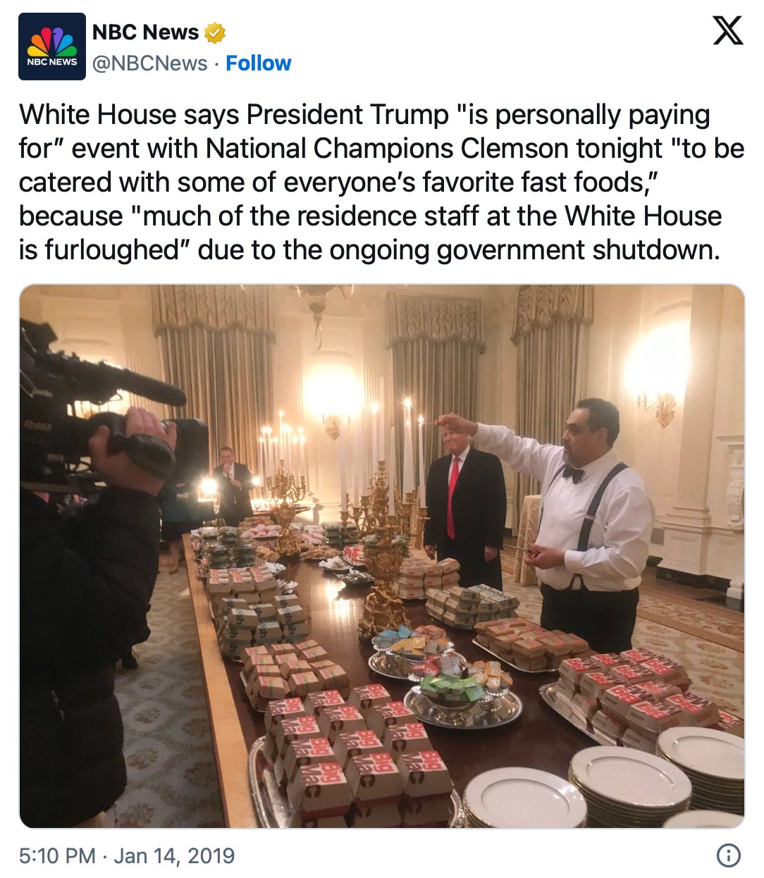 With much of the staff furloughed, the White House ended up serving the Clemson University football team a buffet of McDonald’s, Wendy’s, and Burger King.