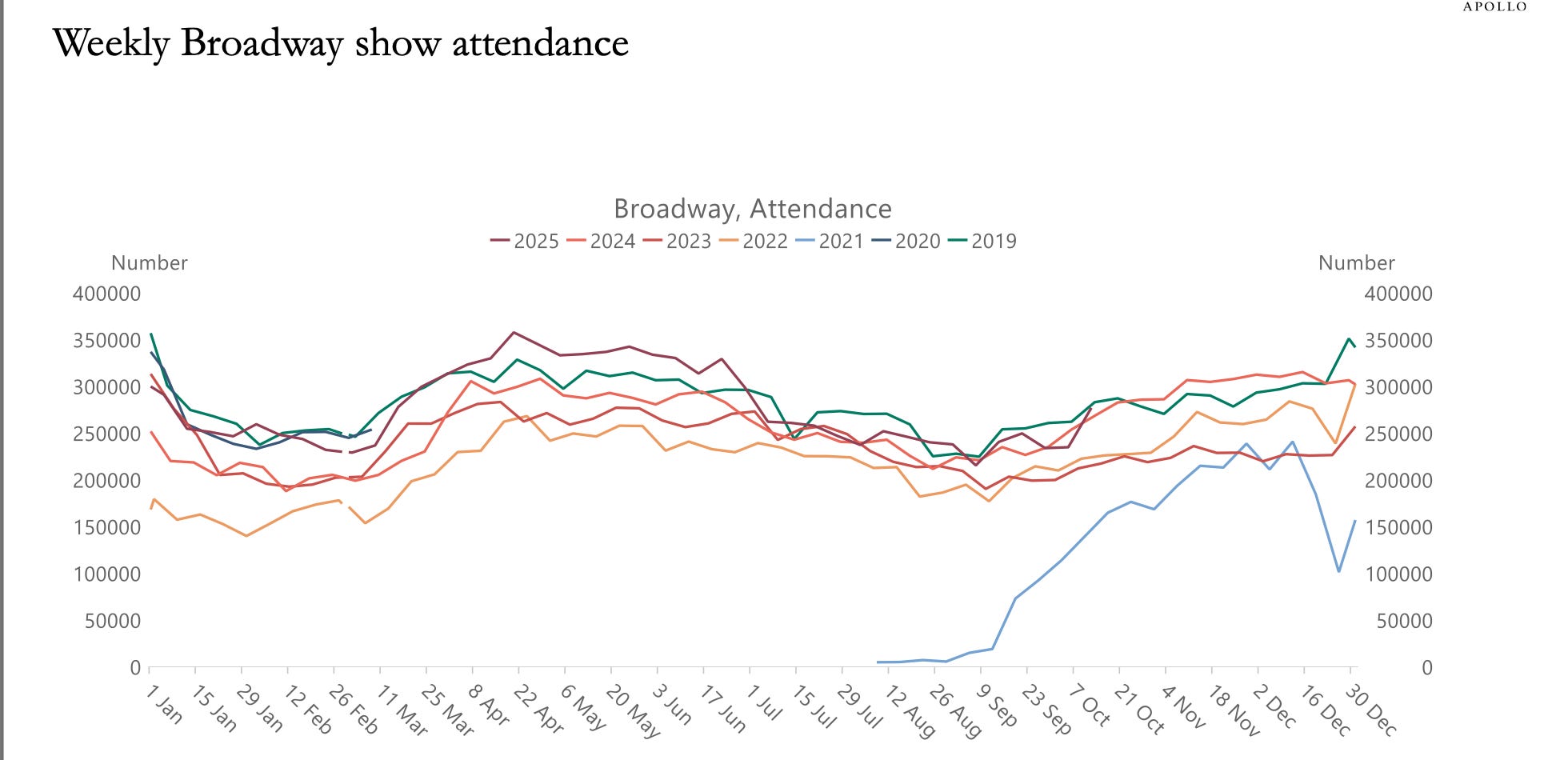 Even the “fun” indicators like box office sales and Broadway attendance have recovered to pre-pandemic volumes. Consumers aren’t pulling back. They’re adapting choosing experiences, not goods, but still spending aggressively.