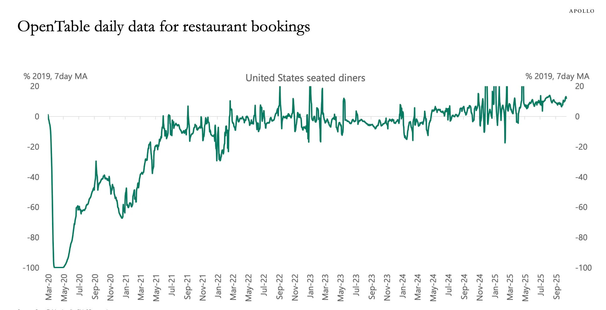 OpenTable reservation data shows restaurant bookings sitting right around pre-pandemic levels. That means people are still eating out, traveling, and living like the recession talk doesn’t exist.