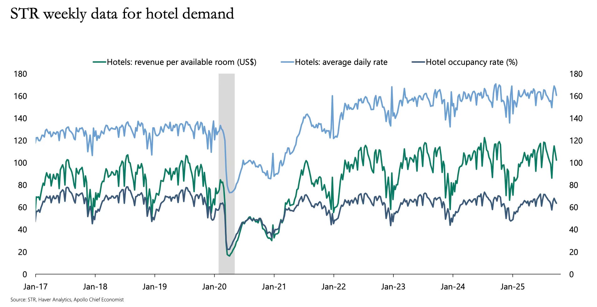 And in hospitality, things look even stronger. STR’s hotel revenue data shows occupancy rates climbing, room prices rising, and total revenue per available room at or near all-time highs. Business travel, leisure travel, weekend getaways, they’re all holding up.