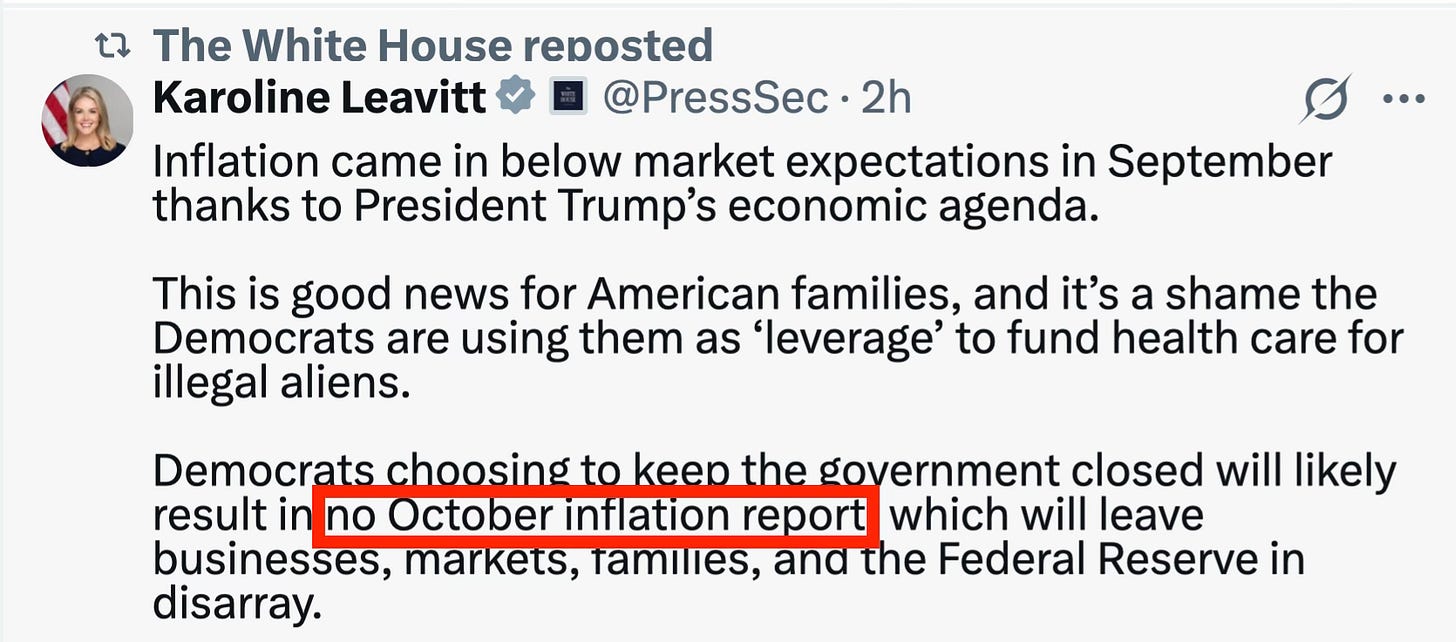The White House has already hinted that the October CPI may never come out. Which means the Federal Reserve will head into its next meeting with no inflation data at all.