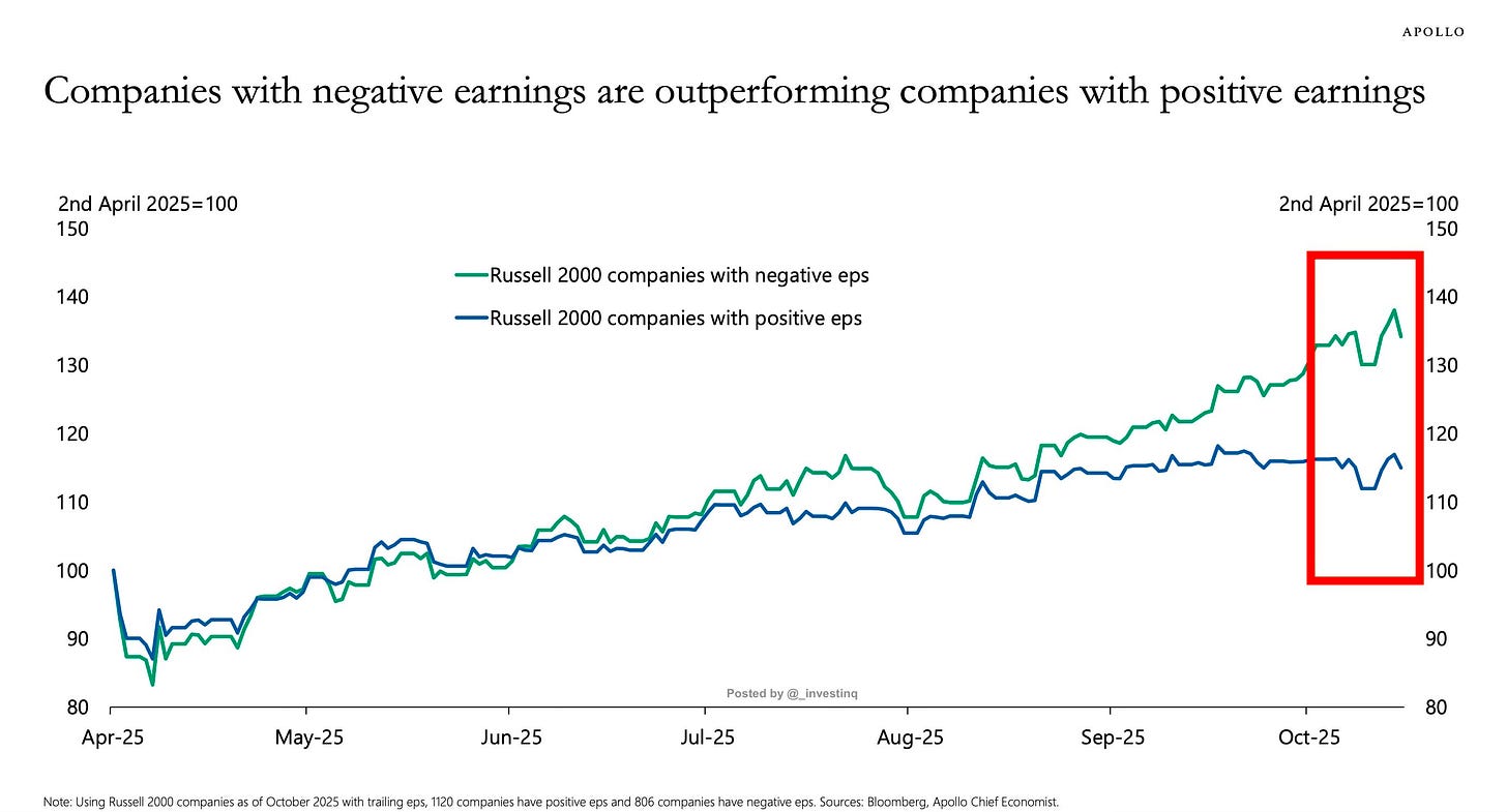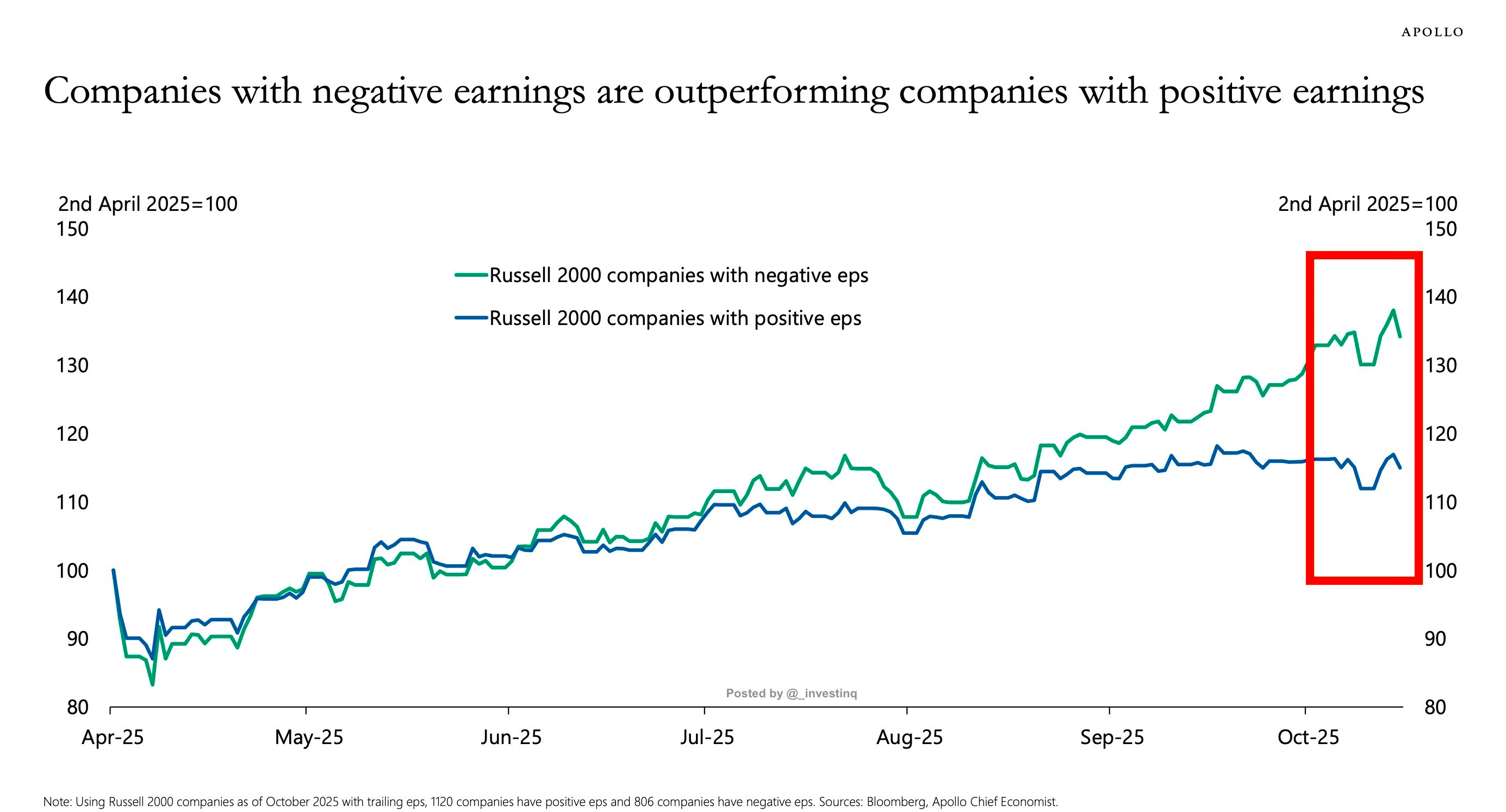 Somewhere between rate cuts and Reddit threads, unprofitable companies started running circles around the ones actually making money. Apollo’s Torsten Sløk dropped a chart that basically says this: since early April, the worst companies in the Russell 2000 have left the profitable ones in the dust. That is not a typo, the losers are winning, and the winners are wondering what just happened.