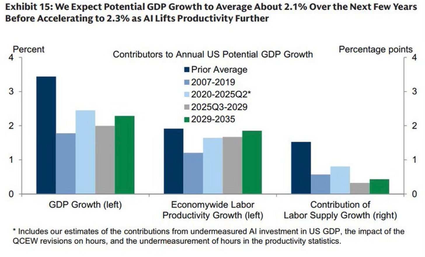 Goldman Sachs estimates AI-driven productivity could lift GDP growth by at least 2.1%. That’s enormous in economic terms. And it’s not just Goldman talking. Deutsche Bank has already warned that without tech spending, GDP would be hovering near recession levels. Nvidia’s chips and hyperscaler CapEx have become the main pillars holding the entire system together