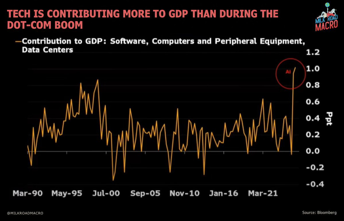 Let’s talk about AI. The numbers don’t lie. The U.S added a full 1% to its GDP in the first half of 2025. That’s bigger than what the dot-com boom managed during its peak. This isn’t just hype on social media or promises in earnings calls, it’s showing up in the data. AI has become the centerpiece of growth while cracks show in the broader economy.