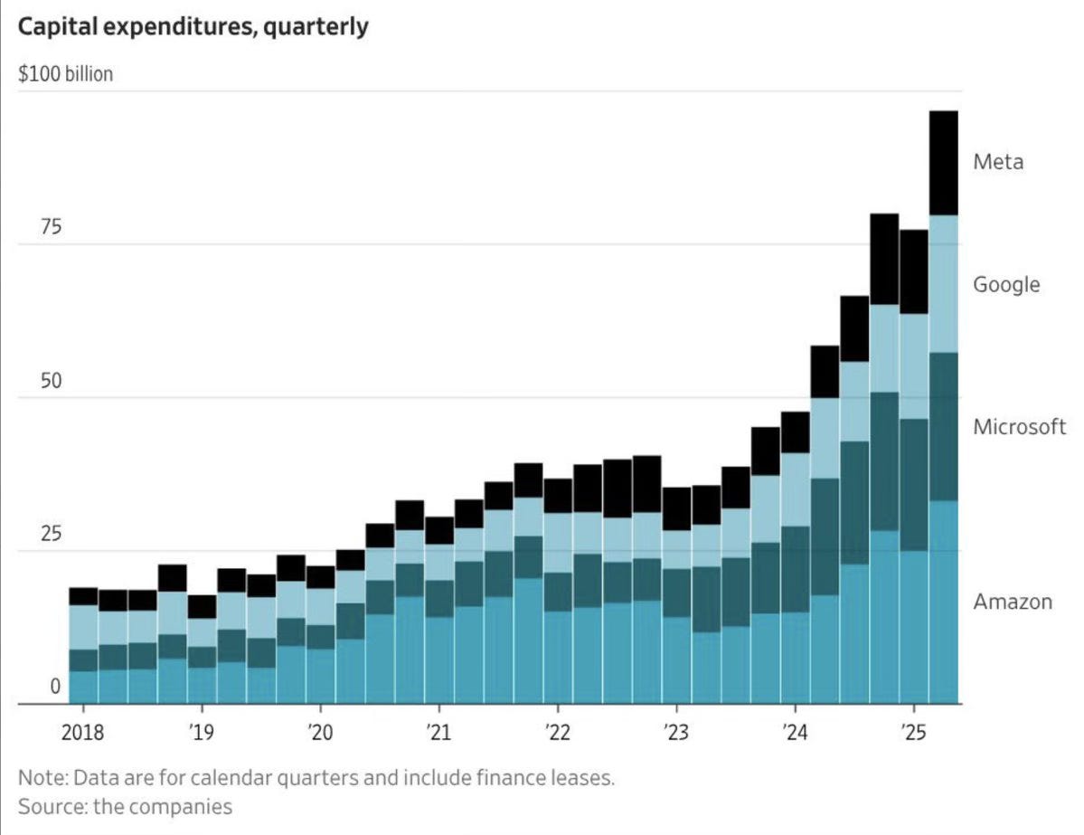 The fuel is corporate spending on a scale we’ve never seen before. Microsoft, Amazon, Google, all of them are pouring money into AI infrastructure. The tab this year is roughly $400 billion. Next year, estimates push it above $500 billion. By 2026, hyperscaler CapEx is projected to hit $433 billion, a 174% jump from 2022. That level of spending explains why GDP still looks strong while other sectors of the economy are soft
